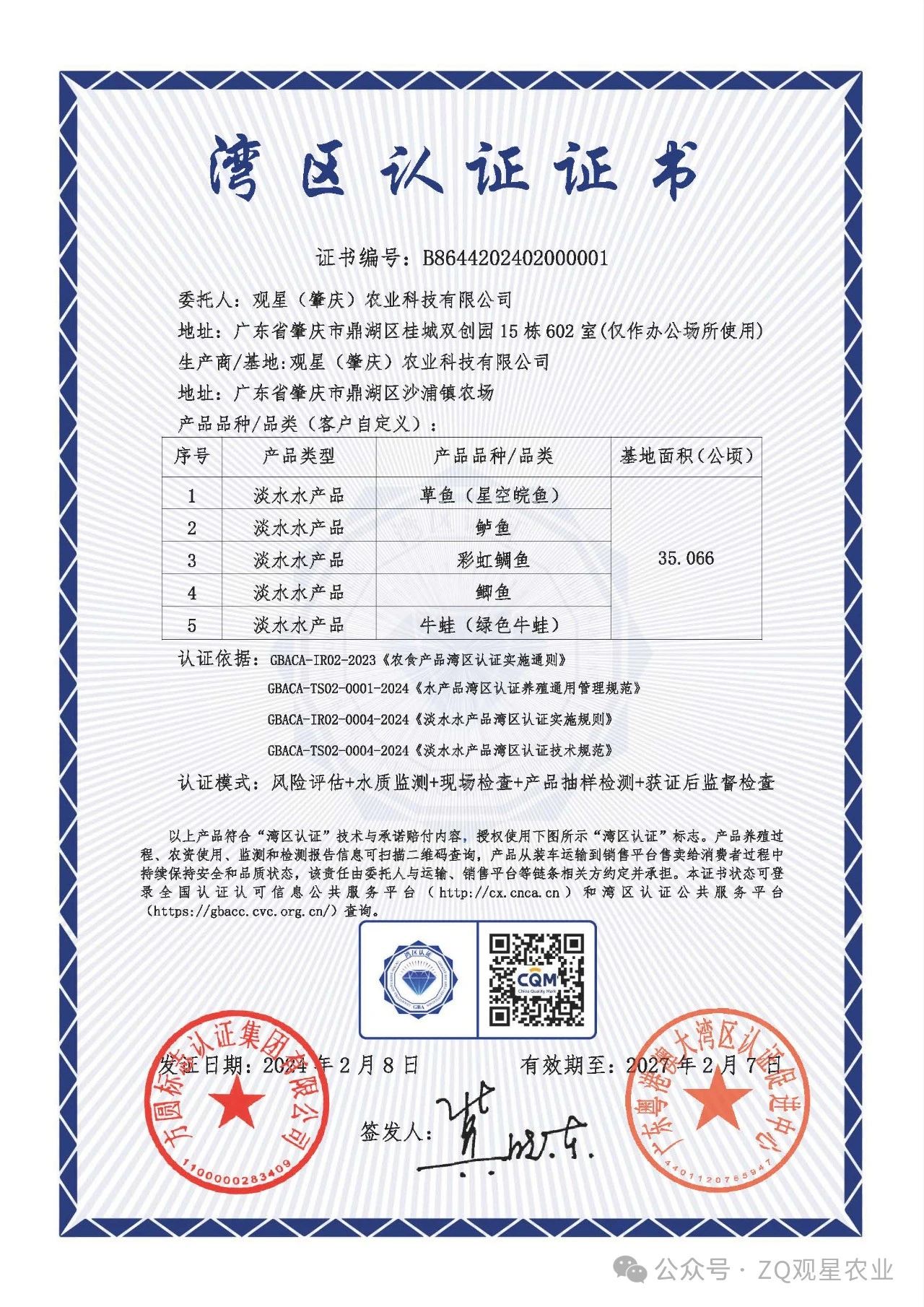 2024年2月8日,觀星農業“四魚一蛙”產品(草魚、鱸魚、彩虹鯛、鯽魚、牛蛙)榮獲全國首張水產品灣區認證證書!
